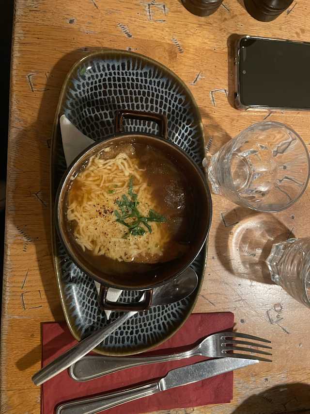 - Soupe a l'oignon assortie de croûtons gratinés à l'emmental