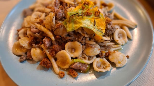 Con ragù bianco, fiori di zucca e pane tostato al rosmarino