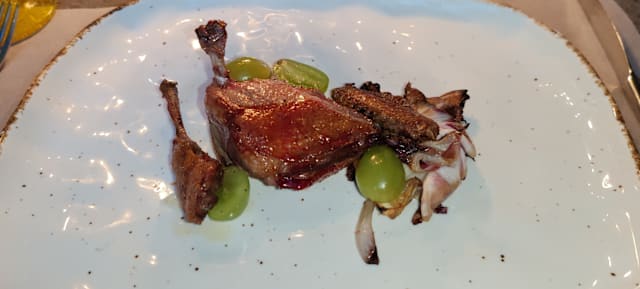 Petto d’anatra sous vide, salsa bruna e miele di castagno con purea di zucca e terra al cacao