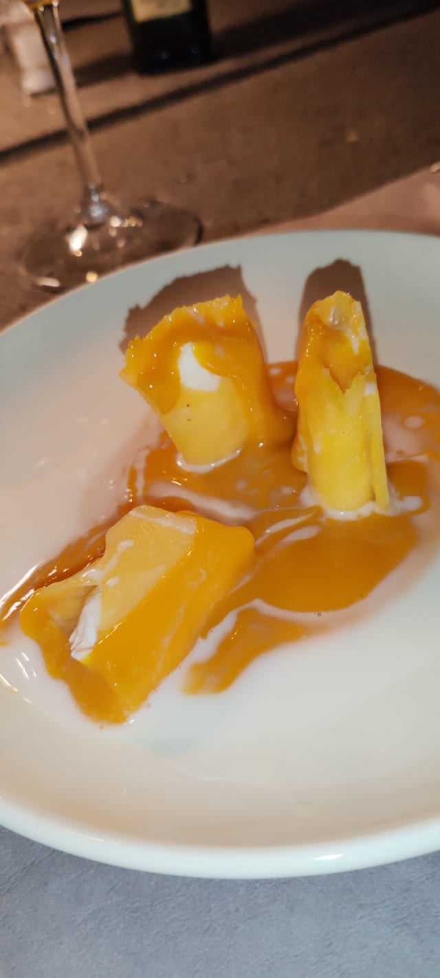 Tortino morbido alla zucca, fonduta al pecorino e crumble di amaretti
