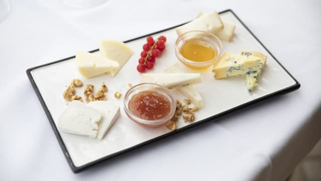 Selezione di formaggi con mostarda di frutta e miele
