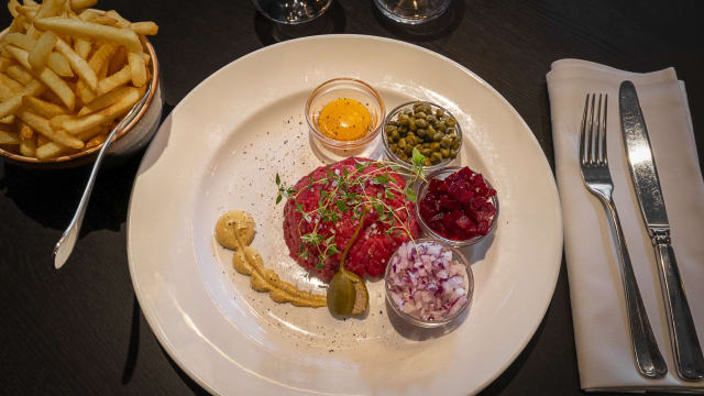 Råbiff med klassiska tillbehör 160 gr serveras med pommes frites