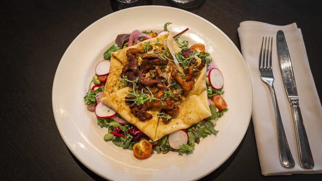 Öppen crêpe fylld med stuvade champinjoner och kantareller, serveras på salladsbädd