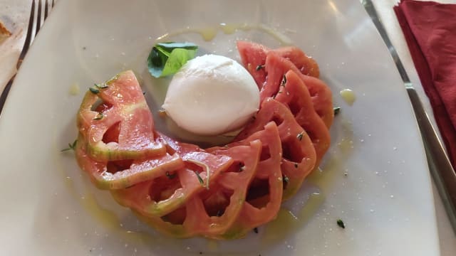 Pomodoro all’ombra, mozzarella di bufala, pomodori ciliegino, basilico, olio evo 100% italiano, all’uscita rucola e burrata
