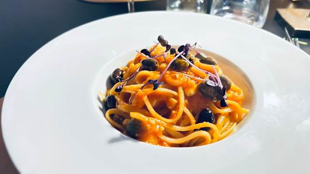 - Tonnarello battuto di spigola agli nero stracciatella di bufala e pomodori confit