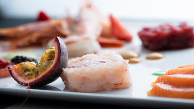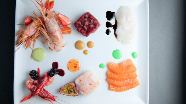 Tartare di tonno, gambero e salmone, gamberi rosa, mazzancolle, ombrina e ricciola sfilettati (servito senza alcun condimento, abbinato a salse che speriamo stimolino i vostri sensi)