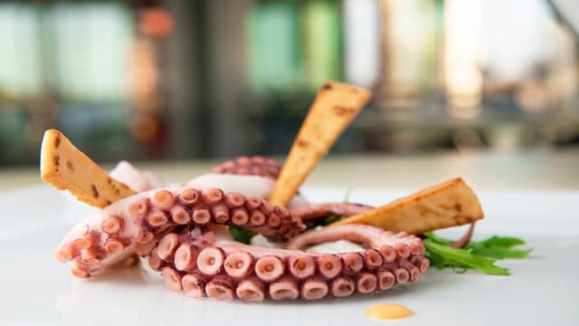 Tentacoli di polpo grigliati, mantecato di patate, taggiasche e pomodoro secco