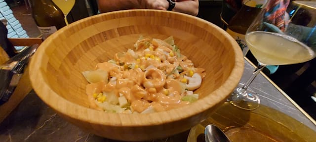 Lechuga, palmito, maíz, queso, pollo, piña y salsa rosa