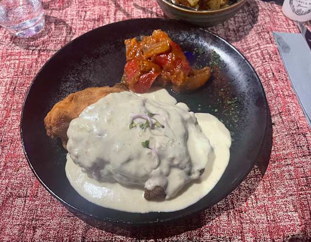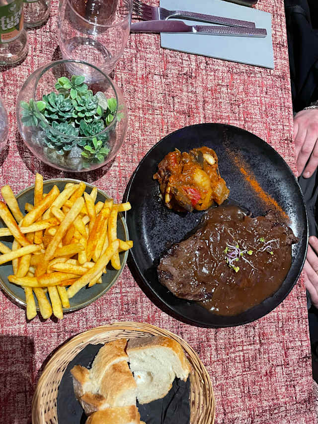 - Sauce échalote, poivre vert, roquefort, maître d'hôtel. Accompagnement frites, spaetzle, pommes sautées, salade verte