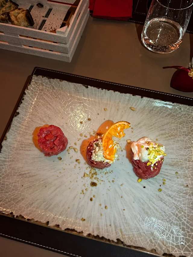 - Battuta di carne, pesto e granella di pistacchi di bronte, burrata di bufala campana