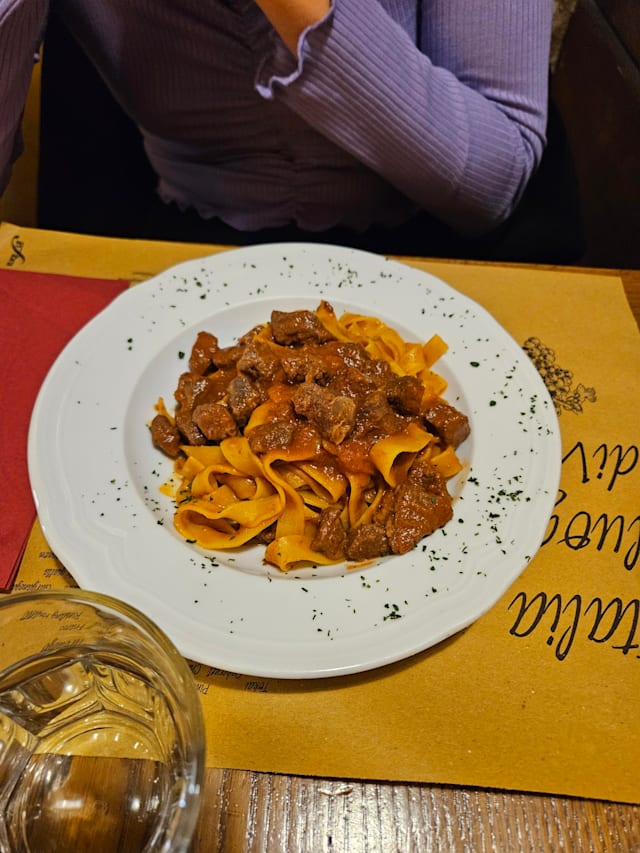Fresh 'pici' pasta with beef strips marinated in chianti wine sauce