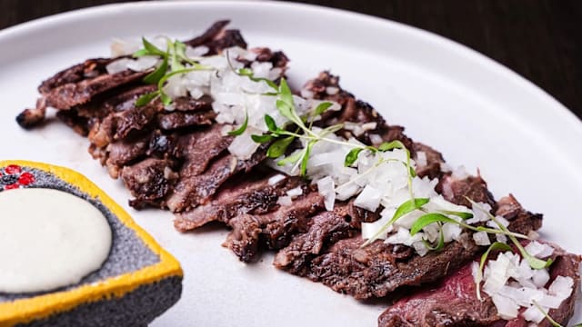 Tiernos y jugosos cortes de arrachera marinados con una mezcla de hierbas frescas, ajo y un toque de especias mexicanas asados al carbón.