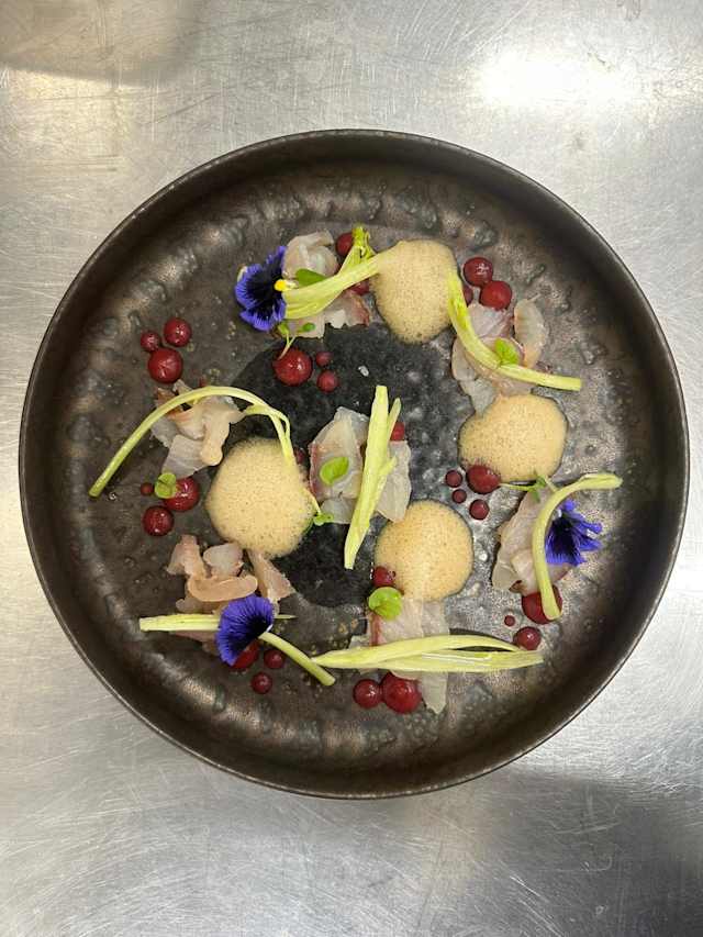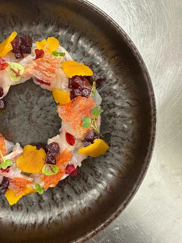 - Spigola in carpaccio con barbabietola in varie consistenze, salsa alla liquirizia e bottarga di muggine