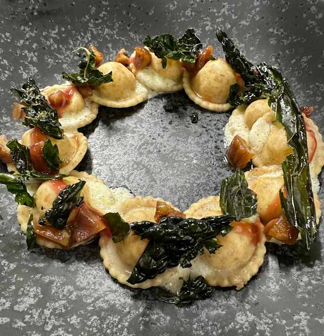 - Raviolo ripieno di stracotto di cinghiale con crema al blue di capra e mirtilli rossi