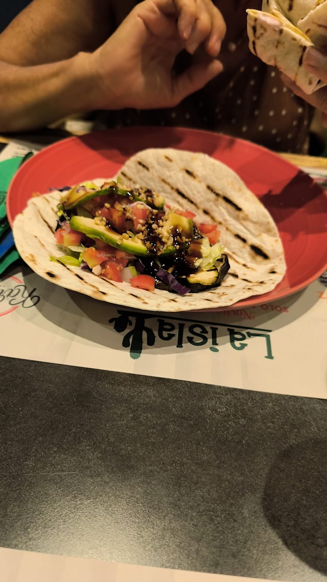 Tortillas morbide, melanzane grigliate e glassate, avocado, cavolo rosso, pico de gallo, insalata iceberg, granella di nocciole e ravanello.