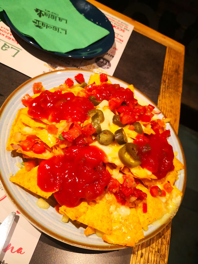 Classico nachos di mais servito con formaggio fuso, pico de gallo, salsa dip e jalapeños.