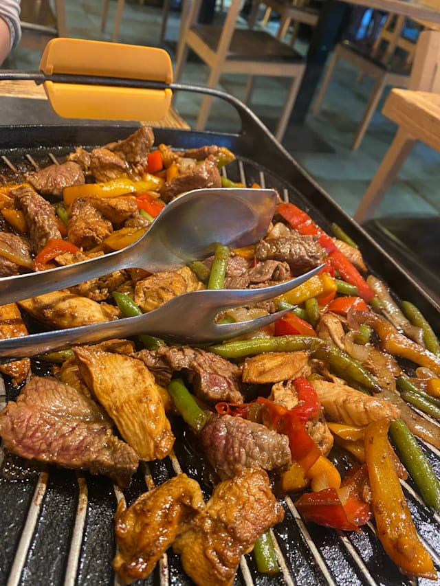 Filetto di manzo saltato con salsa di soia, pomodoro ramato, cipolla rossa, cipollotto e peperone. Servito con patate al forno