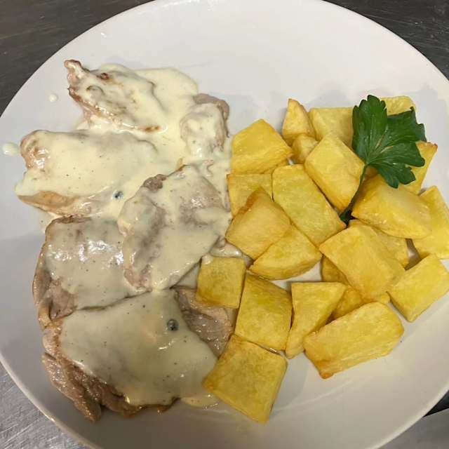 Tiras de solomillo ibérico con salsa de pimienta negra