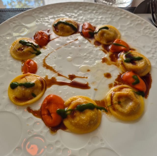 - Raviolo di triglia con crema di cicoria e olio al limone