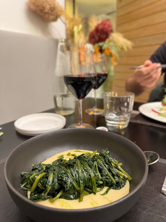 - Orecchietta di grano arso con crema di patata affumicata, foglie miste di campo e olive