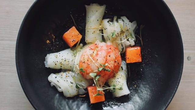 - Spaghettone grezzo, tartare di scampi e il suo ristretto, burrata, finocchietto e pinoli