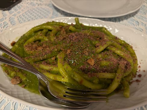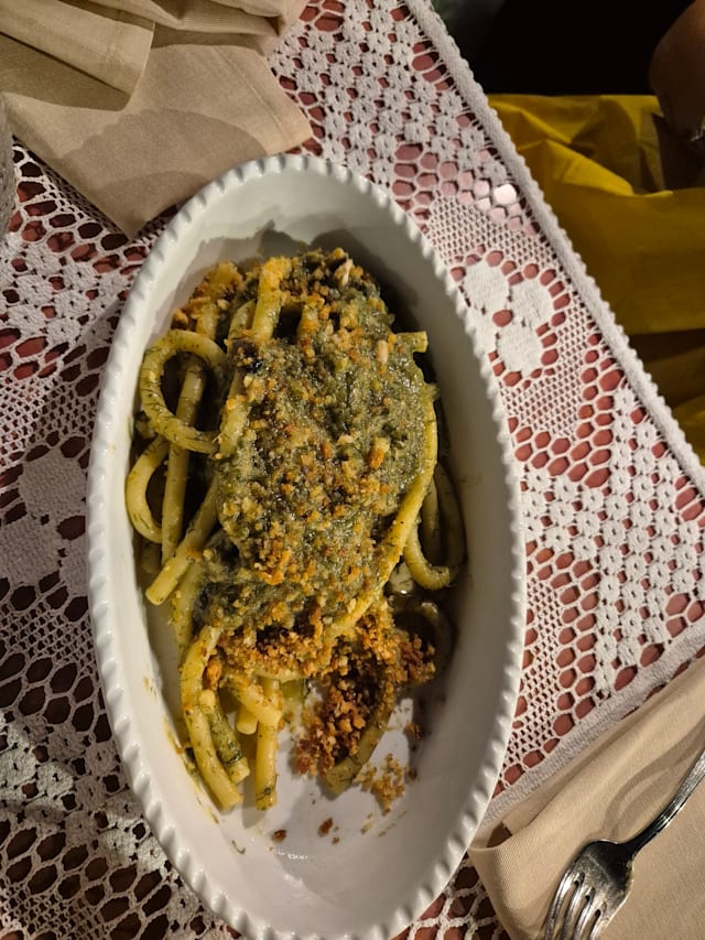 10/10It may seem a bit out there(we were staying in Ortigia and walking) but it was worth every step. Great wine list, really helpful and friendly staff, and maybe one of the best meals we had in our whole month long trip to Italy. We had the Lolli Pasta with Kohlrabi Pesto, which was our favorite, and the Busiate with Broccoli as well as the Caponata. Looking forward to coming back and eating here again!!
