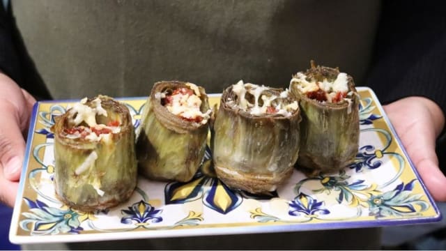 Corazones de alcachofa (alcauciles) al horno con polvo de paleta ibérica