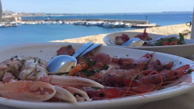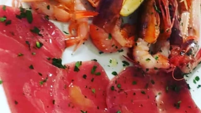 Assaggi di : Alici marinate, Sgombro con cipolla di tropea, Salmone marinato sale e zucchero, Carpaccio di Spada con rucola e cacio, pittule, Panzerotti di patate, polpette di polpo, parmigiana a i frutti di mare, Tortino di patate e totani alla pizzaiola, baccala' fritto su crema di papatate