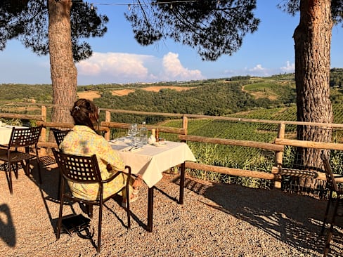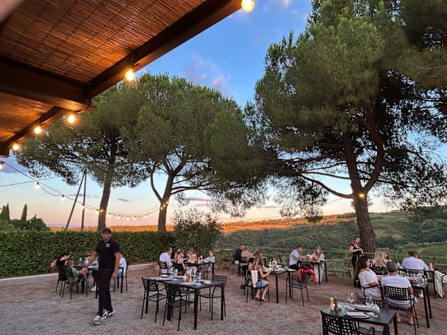 10/10Experience with fantastic servings, and superior wine that they produce on site. The restaurant is located outdoors with a view of the fantastic Tuscan countryside. The owners are part of the staff themselves, and together with the rest of the staff they helped create a relaxed and cozy atmosphere. we will definitely be guests again one day
