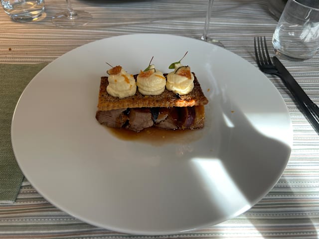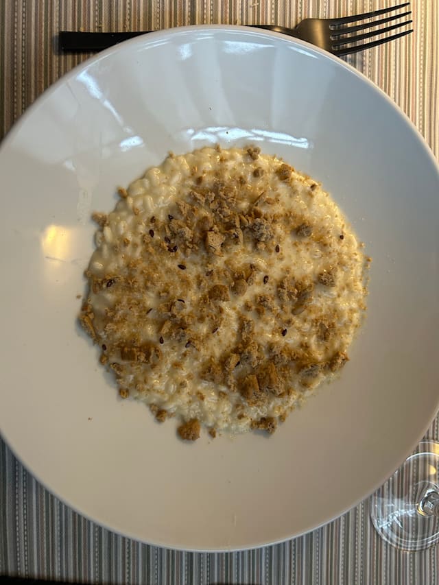 Risotto con crema di fichi e guanciale, mantecato al blu di capra, composta di fichi all’aceto balsamico