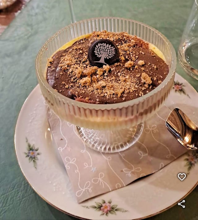 Pan di Spagna al cioccolato e caffè, mousse ti mascarpone , cialda croccante di zucchero a velo, spolverata di cacao amaro.