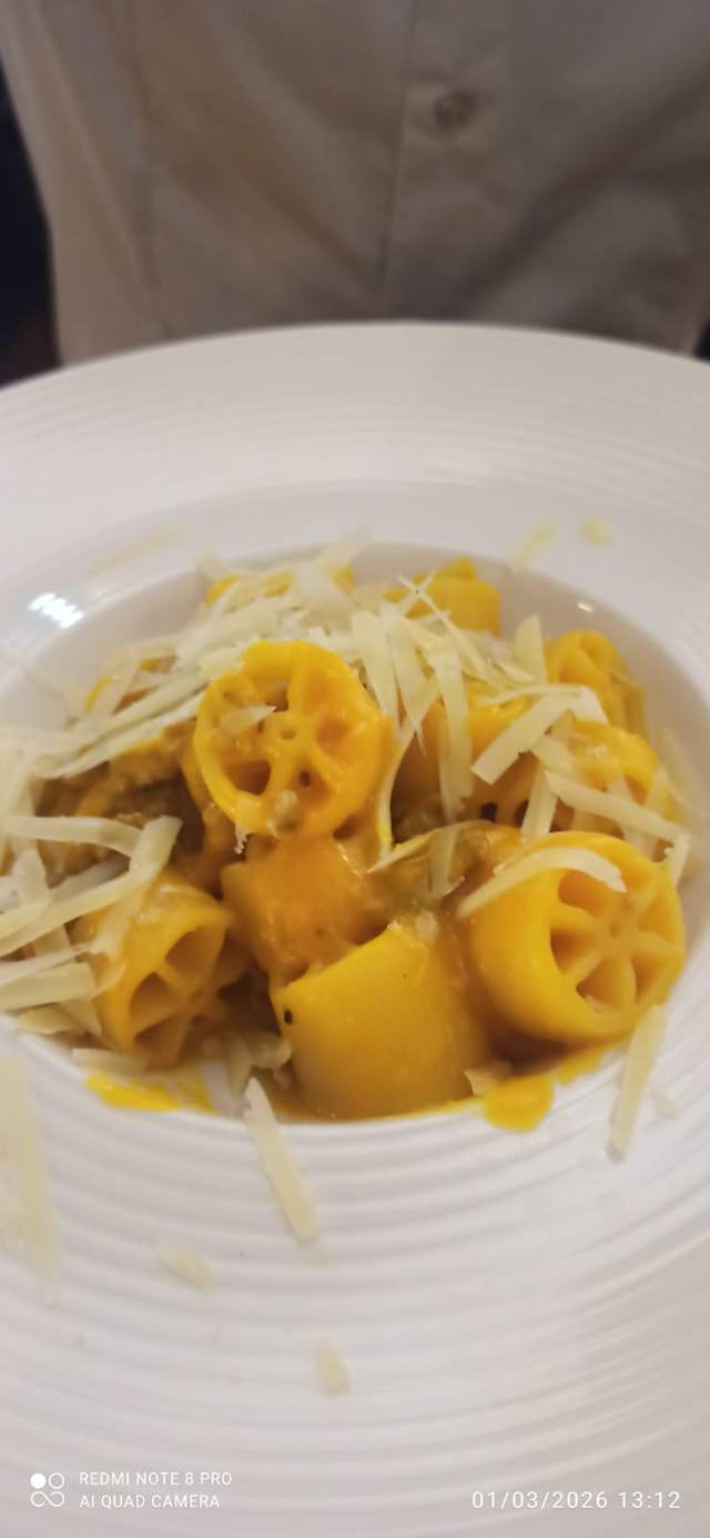 - Ruote pazze con crema di zucca, pestömm e maniva stagionato