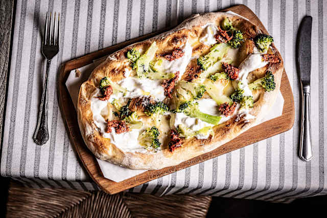- Mozzarella, rucola, salmone affumicato, stracciatella, pomodori secchi e olive nere