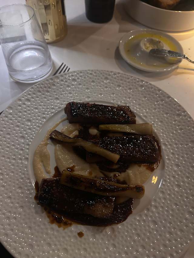- Secreto iberico con sedano rapa e mela verde, porro confit e fondo alla senape