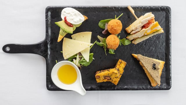 Prosciutto crudo toscano semi-dolce 22 mesi e finocchiona toscana, terrina di fegatini di pollo con pan brioche fatto in casa, bruschetta al pomodoro, pecorino toscano invecchiato in grotta con cipolla caramellata, coccoli e stracchino