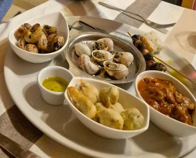 - Mezza porzione rispetto a quella normale di lumache al sugo, fritte, in porchetta, spiedini e alla brace