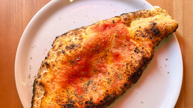 Pizza fritta y al horno con tomate san marzano, orégano , ajo anchoas , tomates semidried y olivas negras