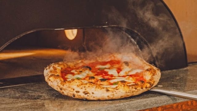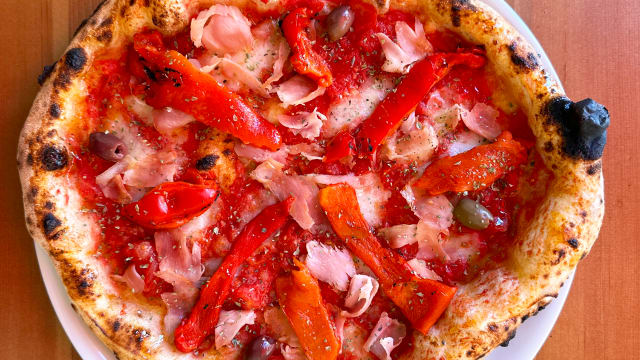 Tomate san marzano, salami piccante lucano, olivas negras, grana padano rallado y orégano