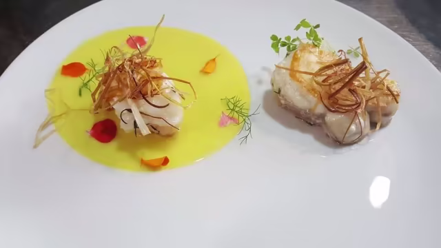 - Capasanta scottata, guanciale croccante, pepe di Sichuan di cipolla, geleè di arancia