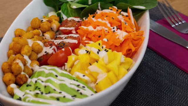 - Nuestra versión: con todos los ingredientes que necesitas para sentirte bien: mango, aguacate, cherry, garbanzos, arroz y algo de verde.