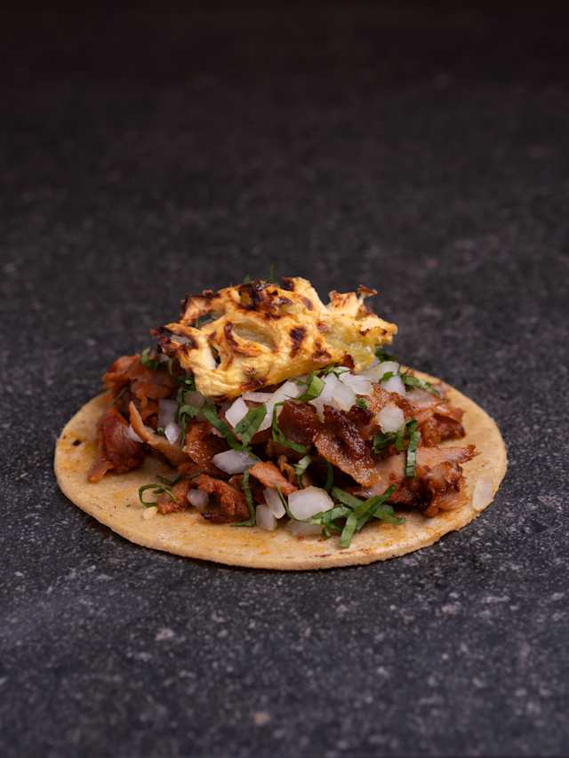 - Nuestra opción vegana: Berenjena marinada al estilo pastor, servida en tortillas de maíz con cebolla, cilantro y piña. Extremadamente sabroso.