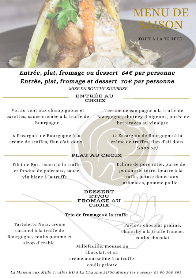 Bonjour Mary Tan, Thank you so much for your feedback! We are delighted that you enjoyed our 100% truffle cuisine — from the flavors to the presentation and the explanations that accompany each dish. Our team is dedicated to offering a unique gastronomic experience around truffles here in Burgundy, perfectly located between Dijon and Beaune. We are also very touched by your kind words about the service. We look forward to welcoming you again for another gourmet journey into the world of truffles!