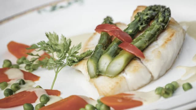 7.5/10Outside terrace with beautiful garden . Very good service . Menu at 58€ . I took foie gras and veal kidney .ok but not fantastic.