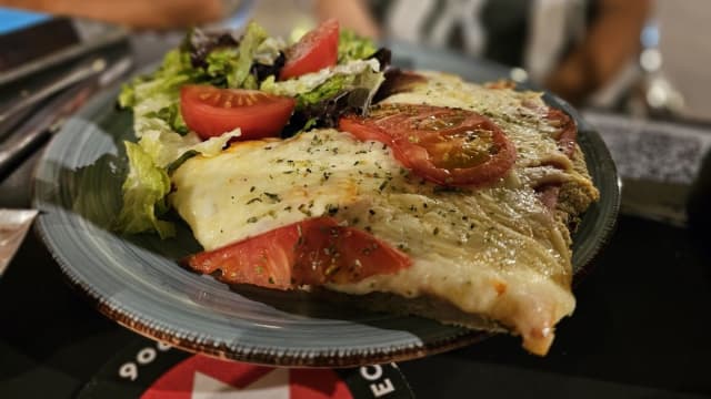 Tomate untado, jamón dulce, queso gouda fundido y orégano