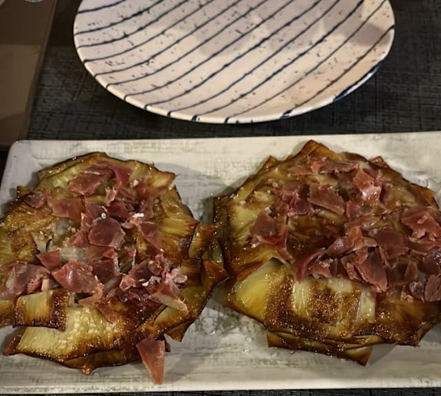 Alcachofas de Tudela, con virutas de Jamón Ibérico y Aceite de Oliva Virgen Extra