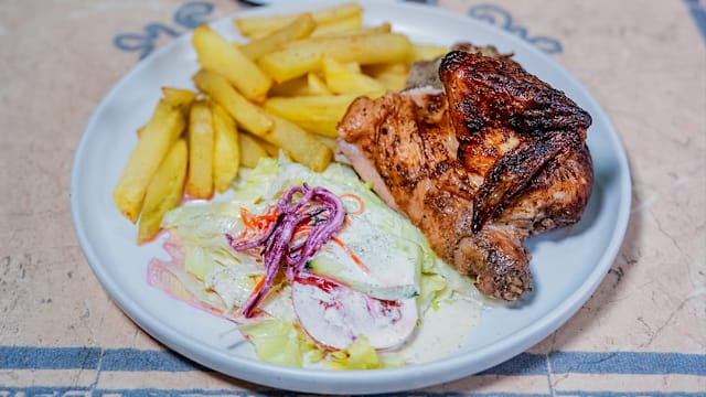 Arroz colorado, cerdo adobado, yuca y camote sancochado y su respectiva sarza criolla.