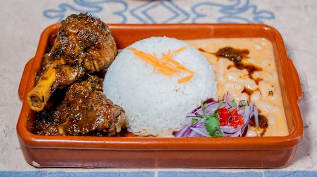 Arroz colorado acompañado de un guiso de choclo con carne, cilantro licuado y este es cubierto con un encebollado, sirvido con ceviche o piqueo de caballa.