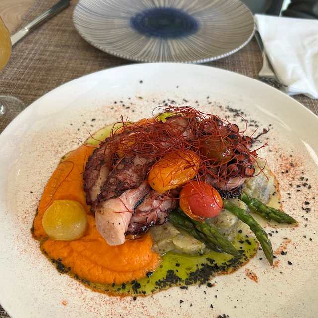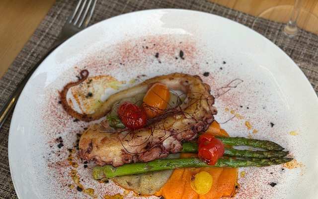 - Pulpo a la brasa con dos parmentiers: de boniato y patatas con trufa