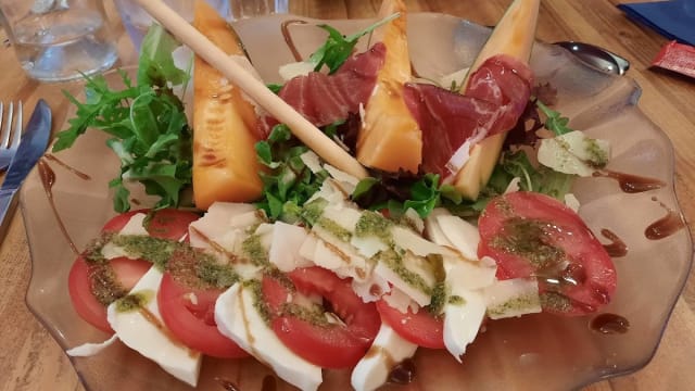 Salade, tomate, jambon cru, melon, cressin, copeaux de parmesan, coppa