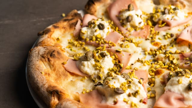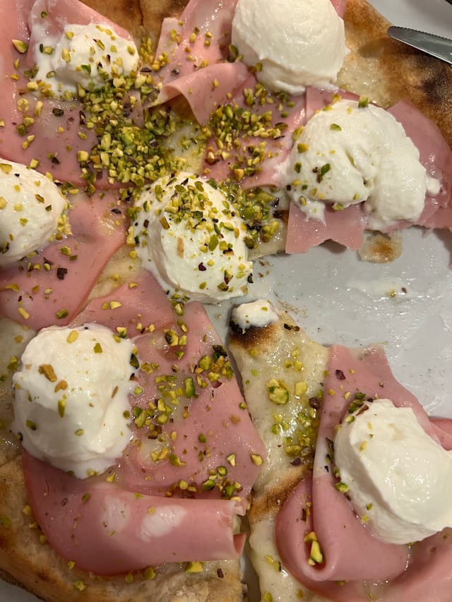 Impasto con farina origine casillo, grano antico solina e senatore cappelli, con mozzarella di bufala, in uscita mortadella, stracciatella e pistacchi.